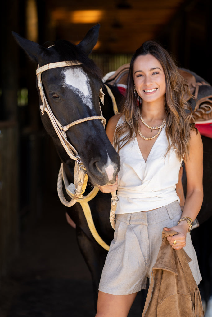 Short tiro medio de lino, tela perfecta para este verano. El lino y el corte de este short lo hace perfecto para tu día. Este short es parte de un set que se forma por un vest, una blusa y un pantalón.