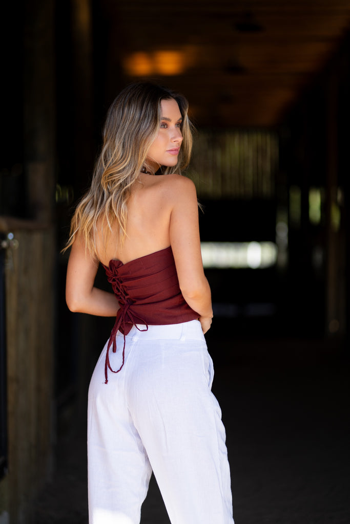 Blusa de lino strapless burdeo. Esta blusa la puedes amarrar en la espalda tipo corsé, por lo que se hace más fácil que la ajustes a tu talla. Tiene tablas en la parte de arriba y va completamente forrada en la misma tela.
