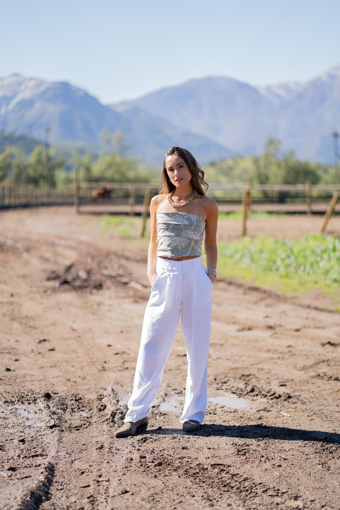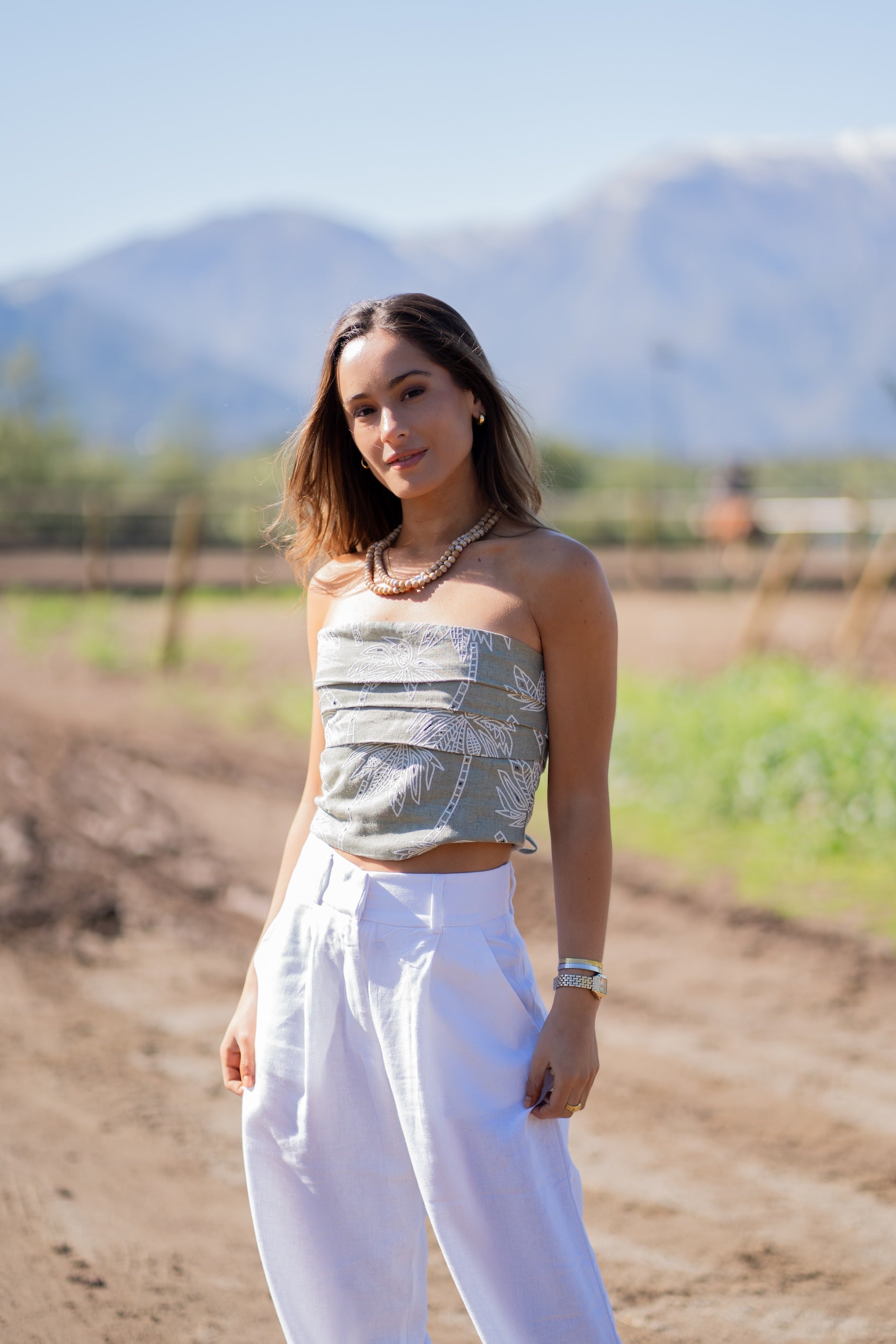 Blusa de lino strapless con palmeras en blanco y fondo de lino verde. Esta blusa la puedes amarrar en la espalda tipo corsé, por lo que se hace más fácil que la ajustes a tu talla. Tiene tablas en la parte de arriba y va completamente forrada en la misma tela.