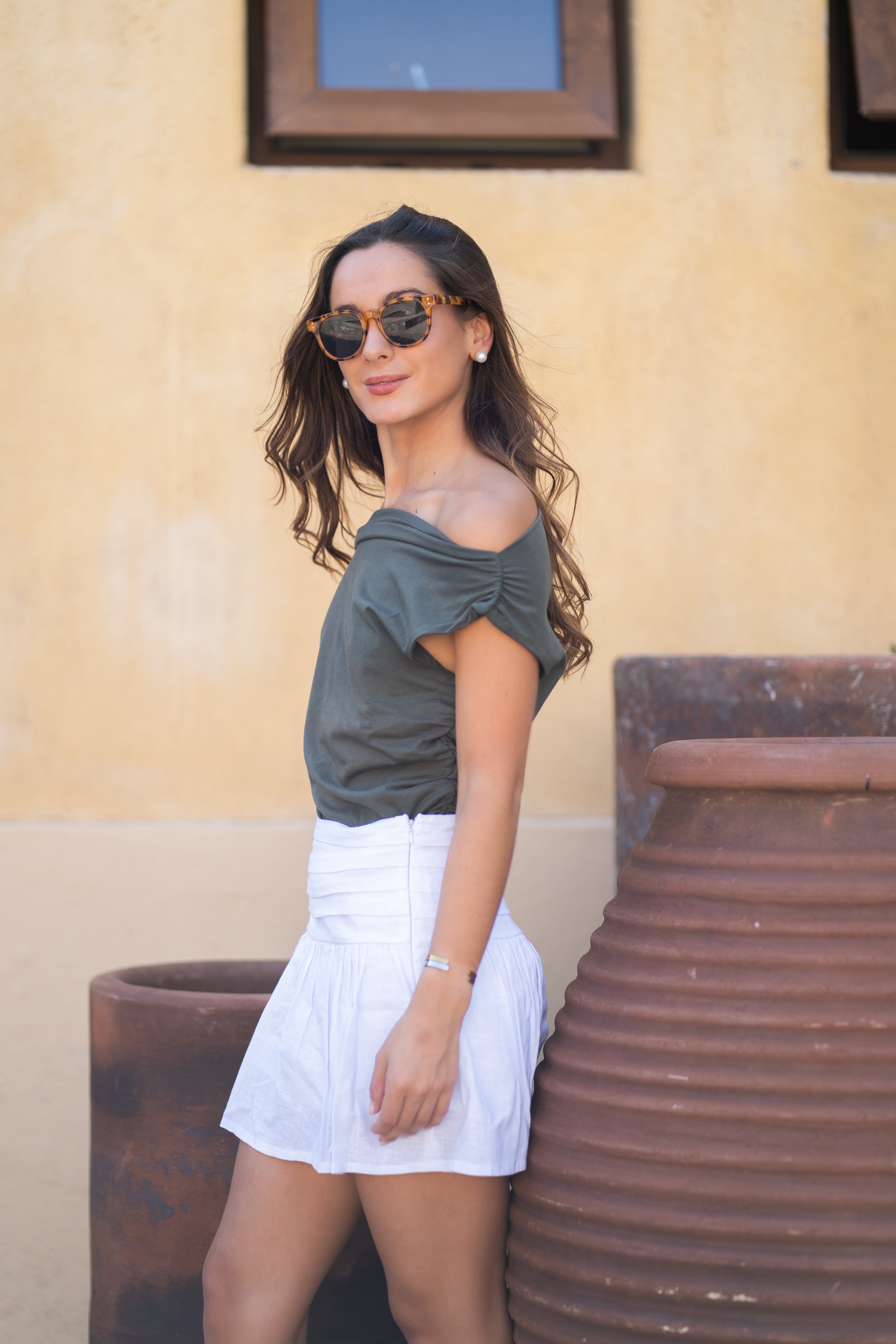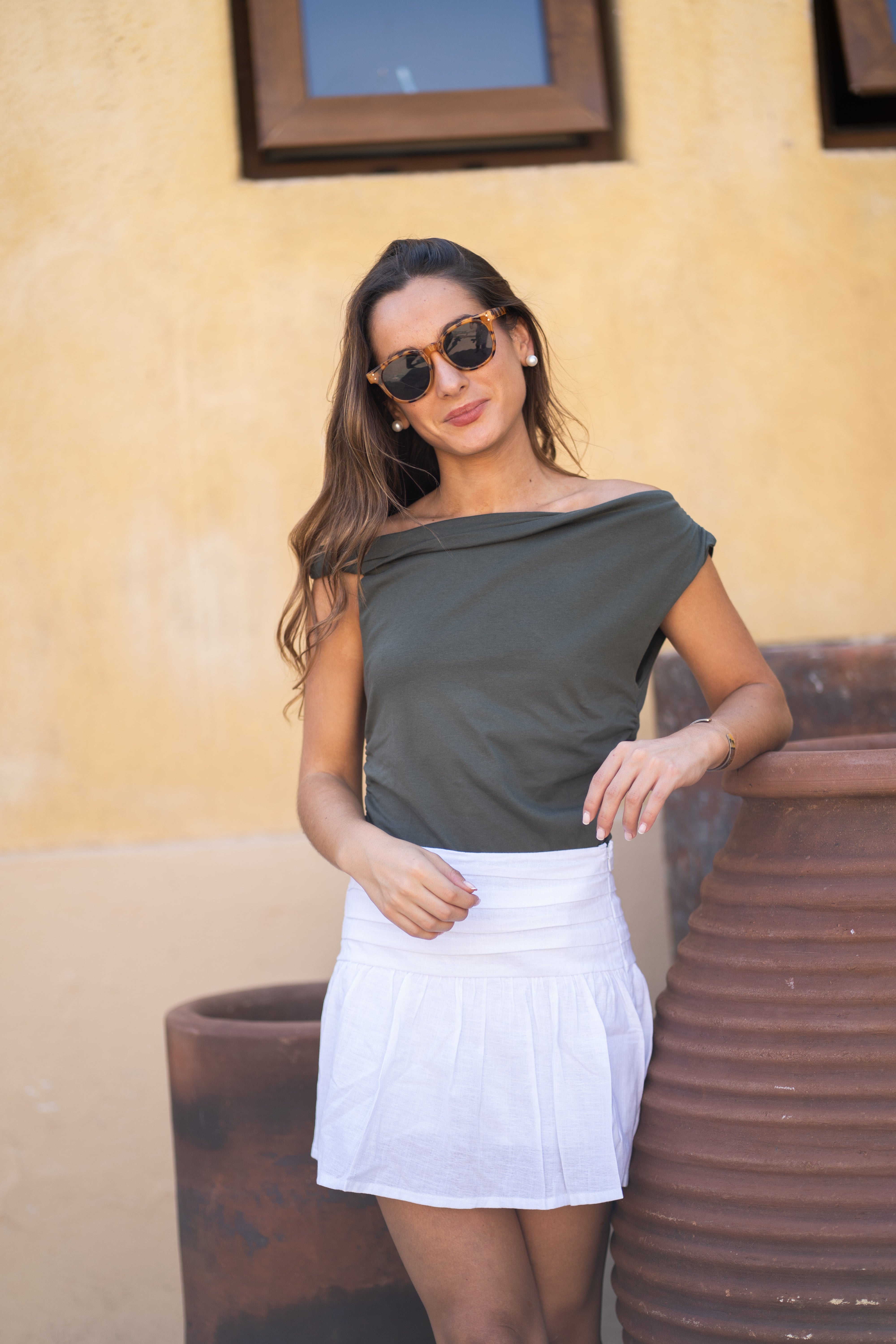 Polera de algodón verde, tiene hombros caídos, lo que la hace perfecta como para la noche y el día. Esta polera está completamente forrada con la misma tela y color.
