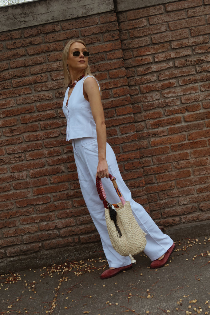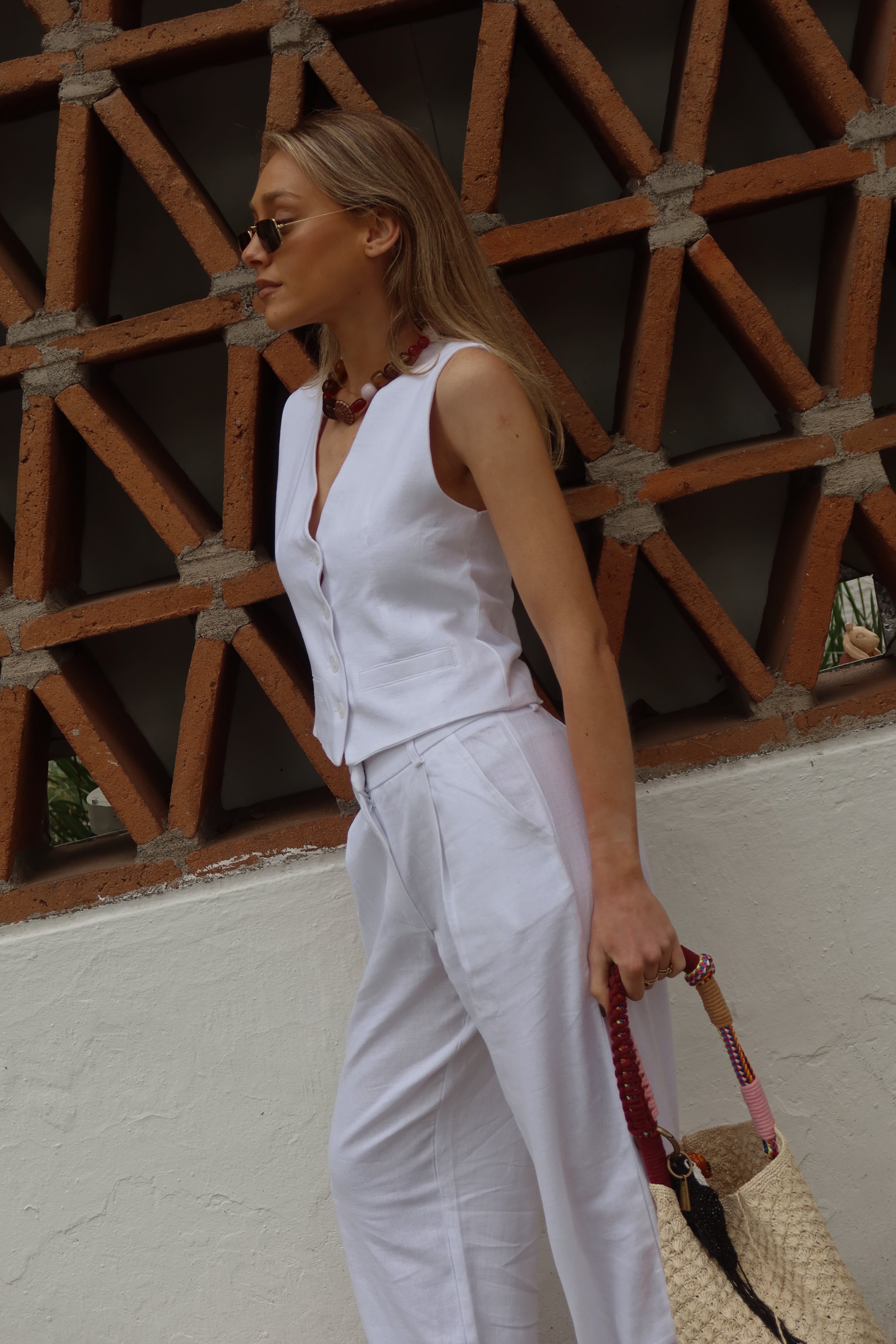 Vest de lino Blanco, el color del verano, tiene muy buen calce y cuenta con una cinta reguladora en la espalda. Puedes completar este look con pantalones, short o mini de la misma tela y color.
