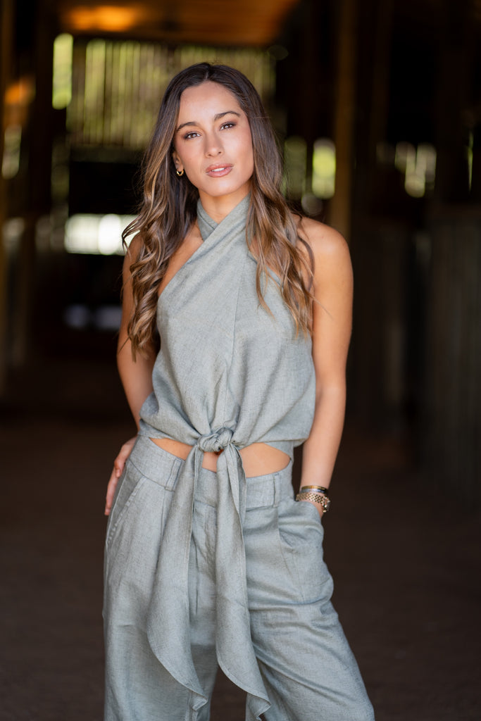 Blusa de lino verde. Esta blusa la puedes amarrar adelante y en la espalda, tiene dos botones en el cuello donde puedes regular también el largo del tirante. La blusa es forrada y está en dos tallas S y M. Puedes complementar el look con los pantalones del mismo color.